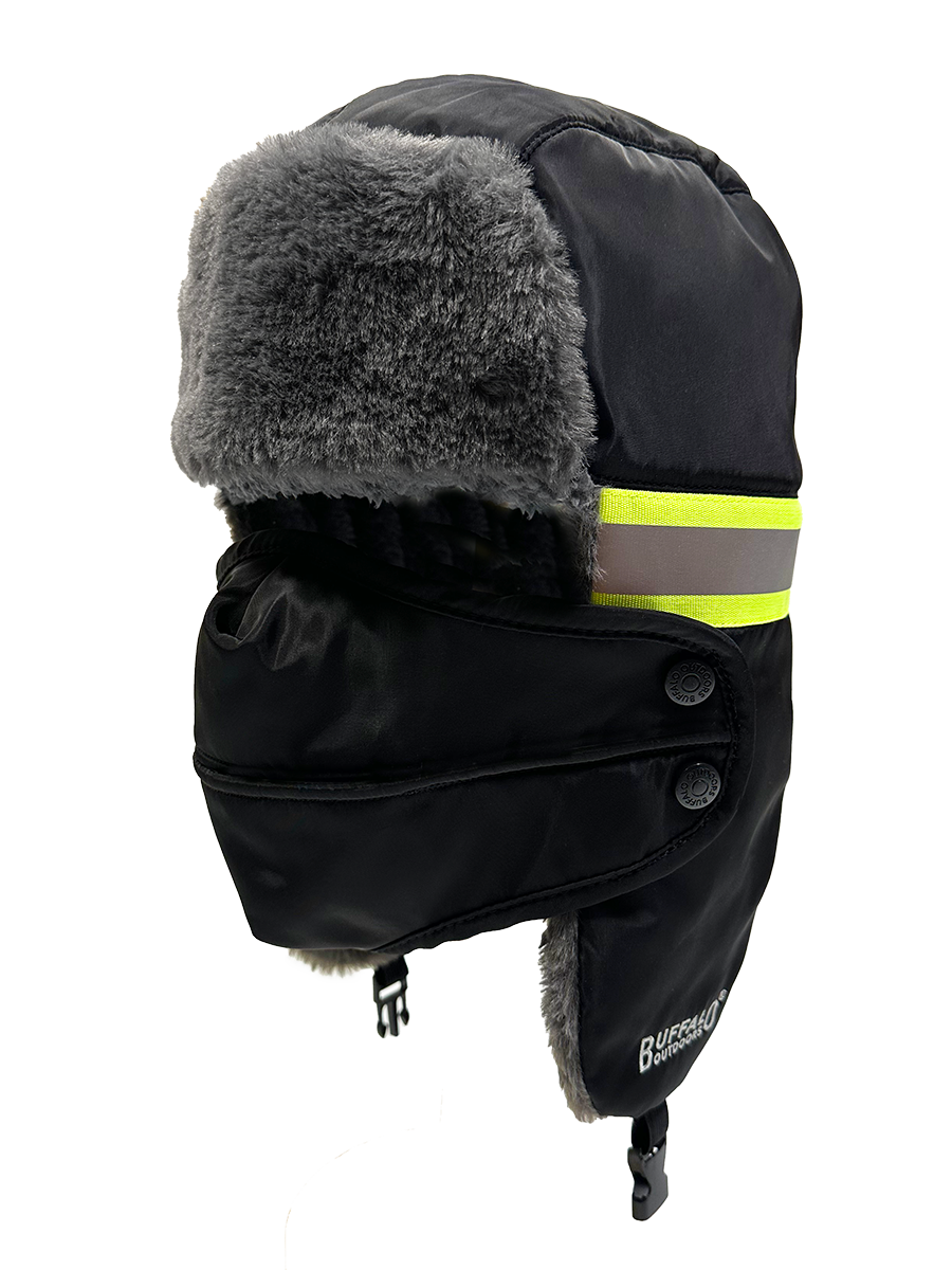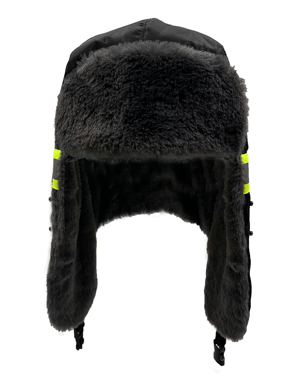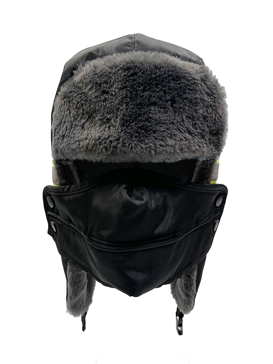 Stay warm and stand out with this stylish Black Reflective Aviator Hat, featuring reflective taping and subtle logo embroidery for a modern, eye-catching look. Designed for maximum versatility, it includes a removable face covering and a luxurious faux fur lining to keep you cozy in cold weather. Perfect for outdoor adventures, this hat combines functionality with bold style